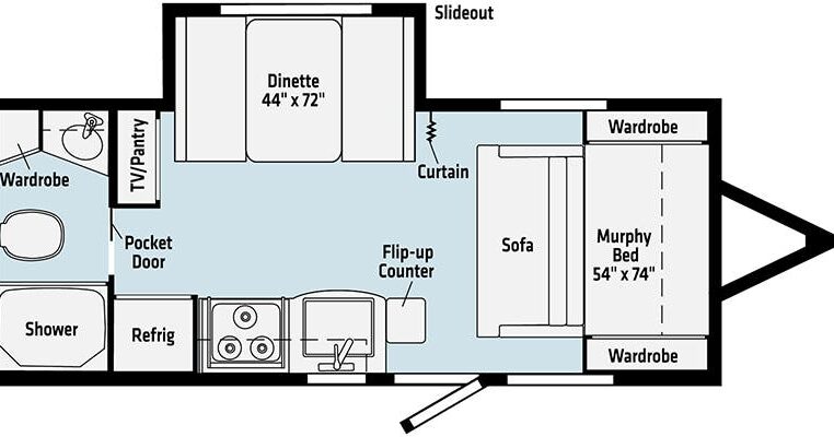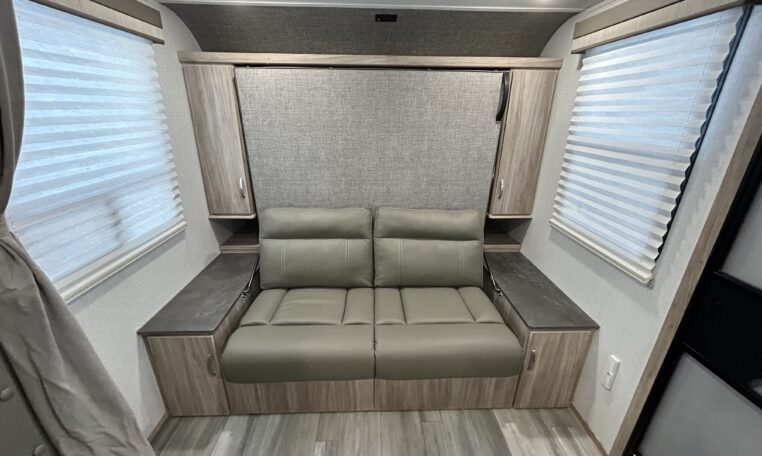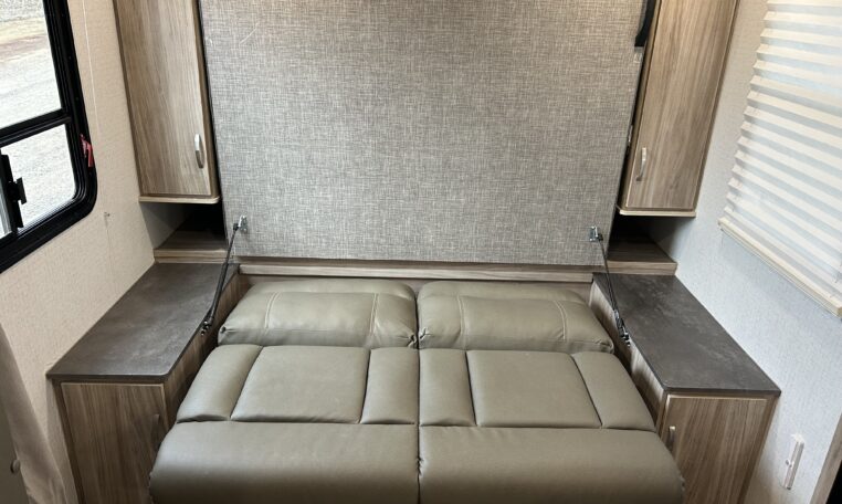 Comfortable sofa in front turns into a Murphy’s bed and provides screened-off sleeping quarters..