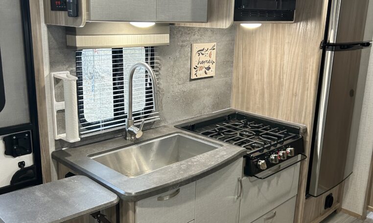 The kitchen has a 3 burner stove top, convection oven/microwave/air fryer and a large refrigerator/freezer.