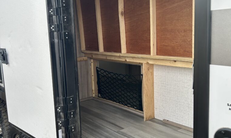 Lower bunk lifts up and offers huge Pack & Play area accessible via exterior door.