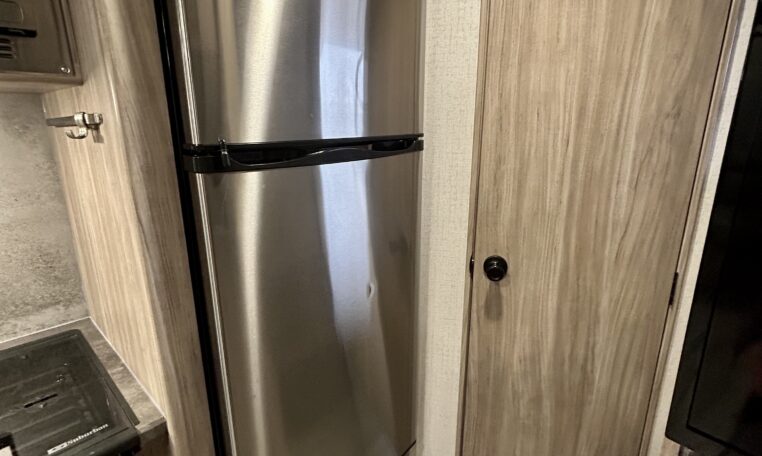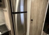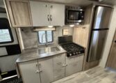 The kitchen has a 3 burner stove top, convection oven/microwave and a residential style refrigerator/freezer.